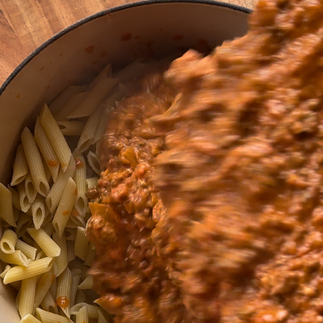 Combine cooked penne and tomato beef mixture in a large dutch oven