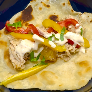 Serve with sliced bell peppers, tomatoes & green onions on warm tortillas or flatbread!